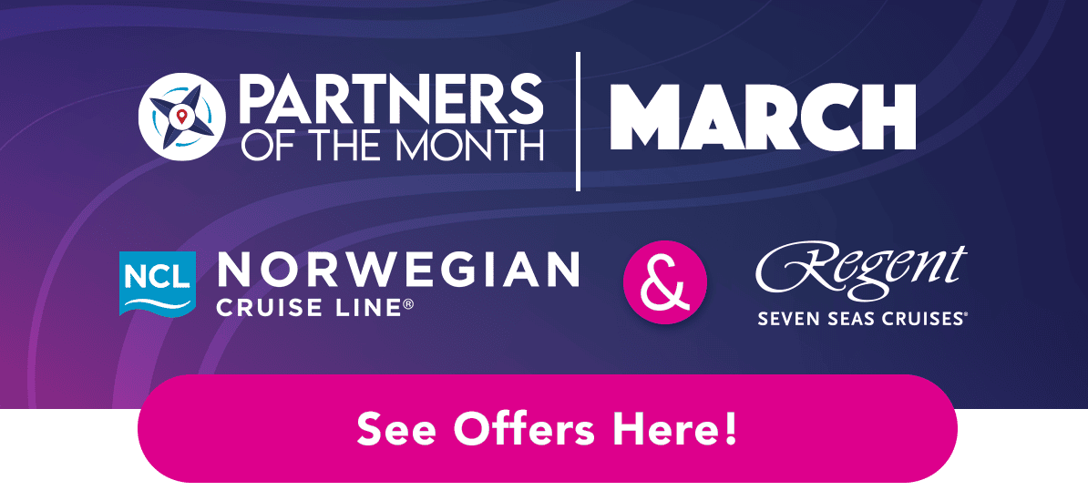 We receive deals ALL the time for you and your clients from our Preferred Partners! This includes limited-time offers AND reduced cruise rates. Go to the "ALL PROMOTIONS" tab on our Promotions website (button below) to see our Preferred Partners' BEST deals. You can ALSO click on the PARTNER LOGOS or the BLUE BUTTONS below to see all the DETAILS about the newest promotions you will find on this page. 🌟
